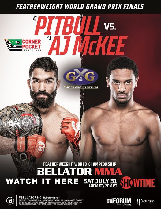 McKee staff picks and predictions New 8 comments Check out the Bloody Elbow staffs picks and predictions for Bellator 263. McKee July 31 2021 The Forum Inglewood California Main Card Showtime 10 pm. Patricio Pitbull 17-9 and AJ.